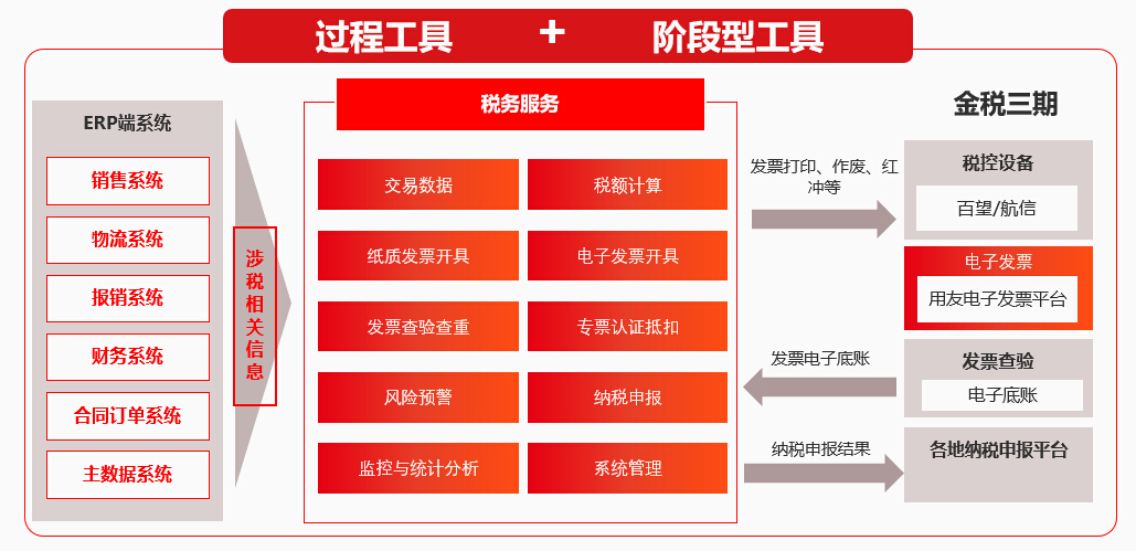 如果想讓系統(tǒng)自動去識別風(fēng)險、規(guī)避風(fēng)險,就需要將企業(yè)的數(shù)據(jù)納入系統(tǒng),而且是盡可能多的數(shù)據(jù)納入到系統(tǒng)。所以企業(yè)ERP端就需要將盡可能多的數(shù)據(jù)納進來,如銷售系統(tǒng)、物流系統(tǒng)、報銷系統(tǒng)、財務(wù)系統(tǒng)等等模塊形成過程型管理和信息收集。形成綜合的涉稅信息,涉稅信息通過我們稅務(wù)風(fēng)控模型進行財稅數(shù)據(jù)的風(fēng)險識別和預(yù)警,早發(fā)現(xiàn)早防范,進行階段性管理。