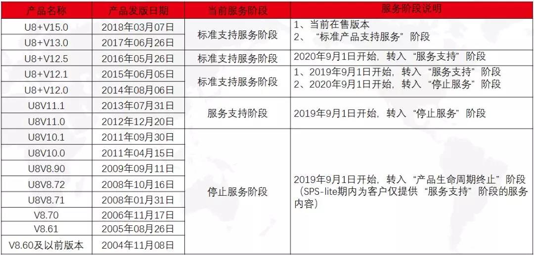 那么您使用的軟件當前處在哪個階段呢?小編也整理了一個不同U8+產(chǎn)品版本所處服務階段列表: